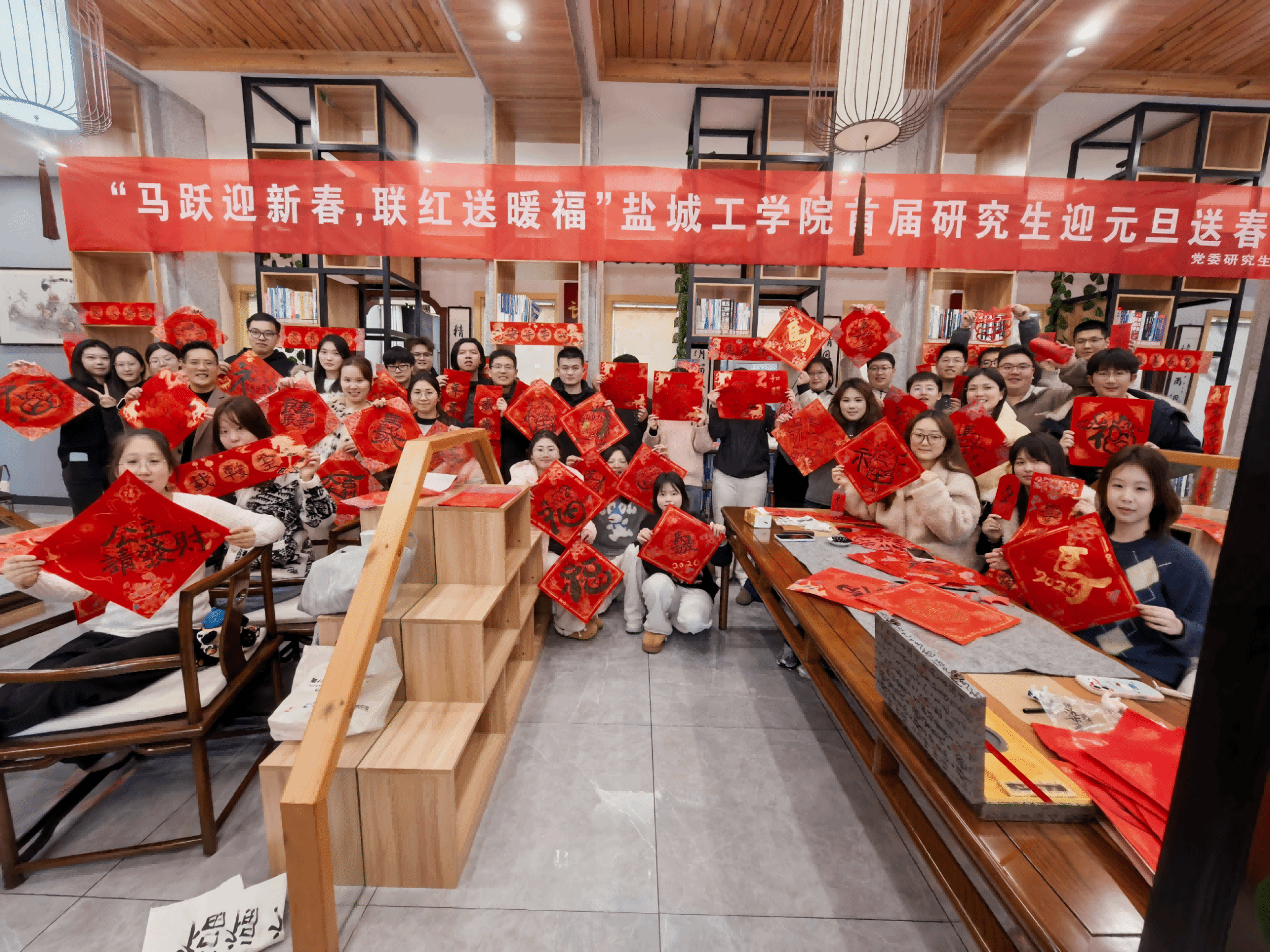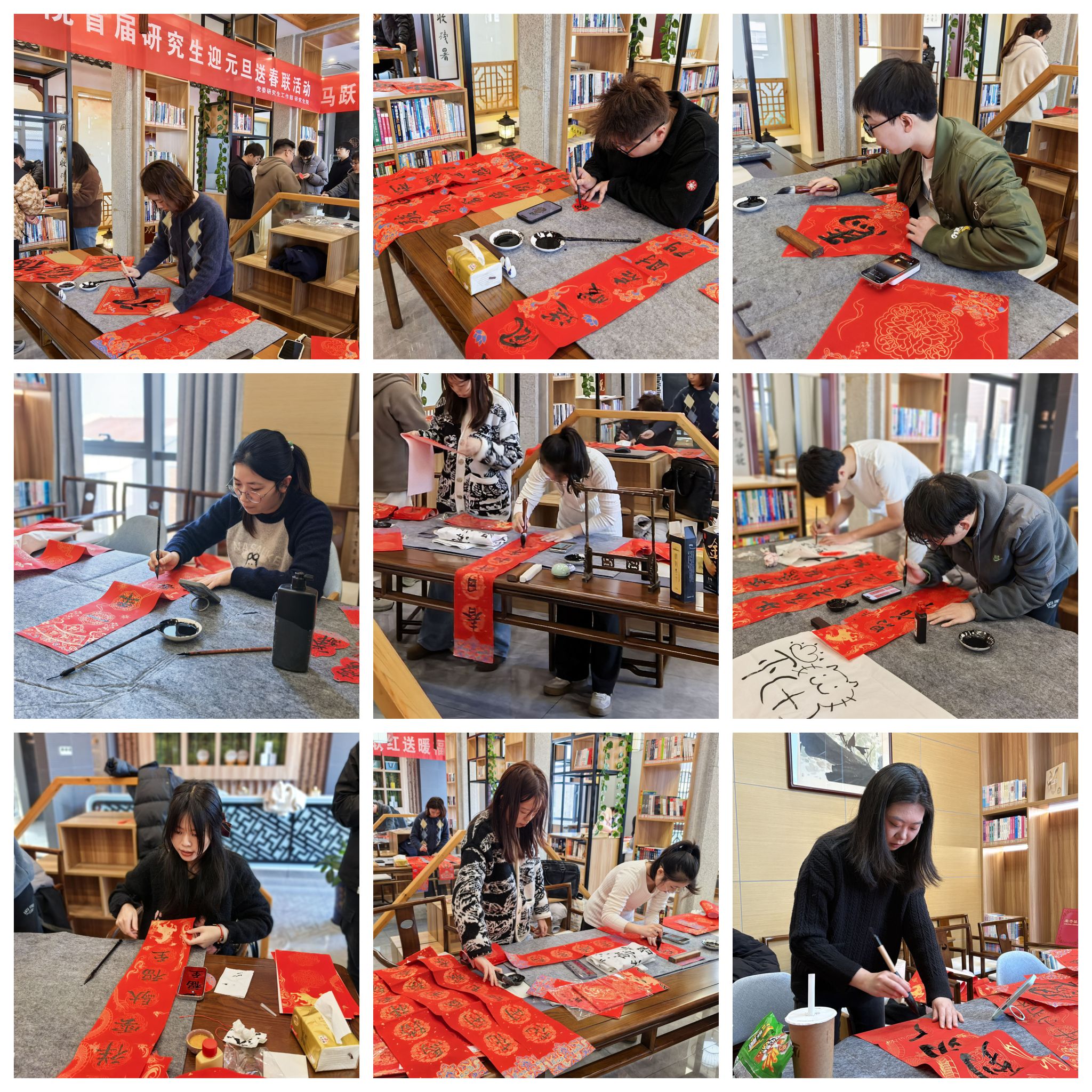 翰墨传情,送暖入心。为深入弘扬中华优秀传统文化,引导青年学生感受楹联艺术魅力,营造祥和温馨的新年氛围,12月30日下午,党委研究生工作部联合学生社区第十三党支部,在盐龙湖校区盐龙书屋二楼大厅组织开展了“马跃迎新春,联红送暖福”首届研究生迎元旦送春联活动。研究生辅导员及2025级研究生等80余人参加。