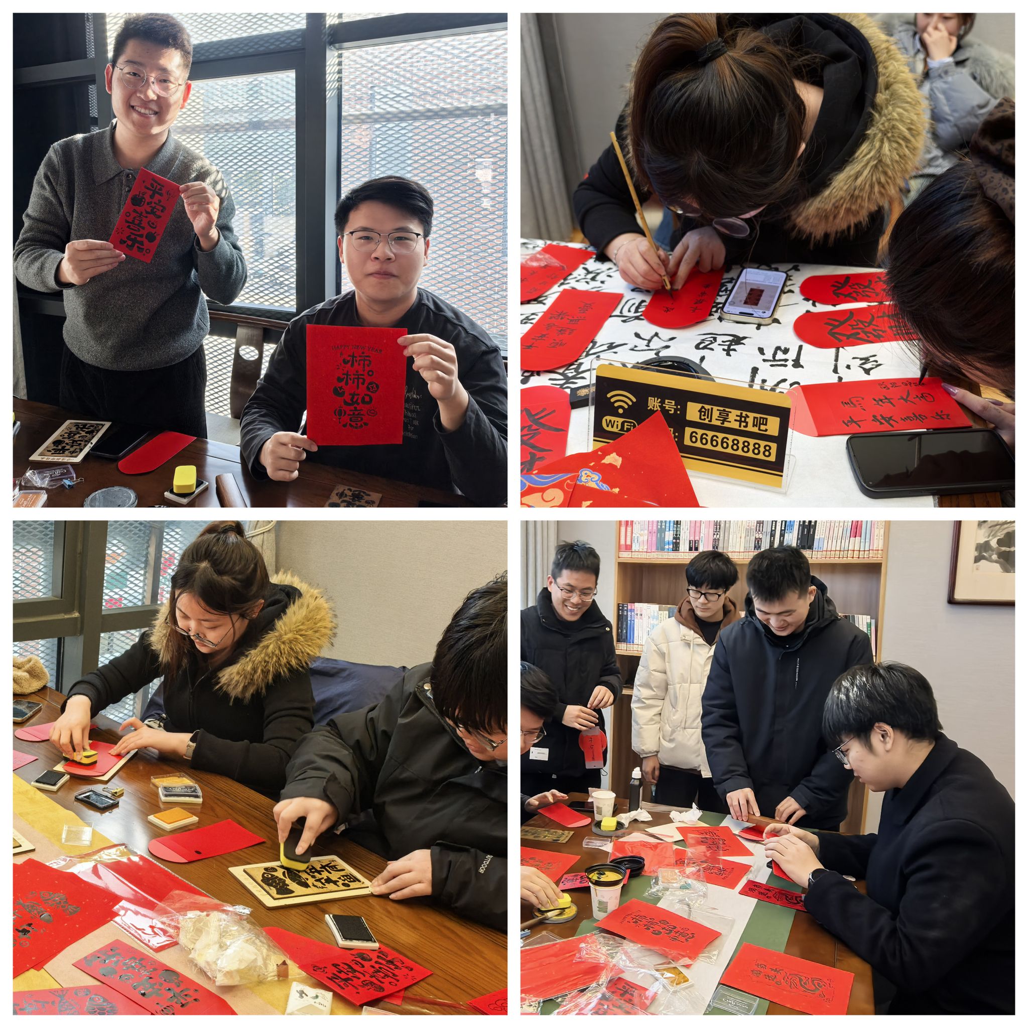 活动现场墨香氤氲,暖意融融,设有写对联、剪窗花、拓印红包三个环节。同学们围绕新年祝福等主题挥毫创作,将对新岁的期盼与家国深情凝于笔端;红纸在巧手中翻飞,裁出各式吉祥图案;更将春联与剪纸艺术结合,拓印成独具创意的专属红包。全场洋溢着浓厚的节日气氛与欢声笑语。活动尾声,师生将亲手完成的作品赠予导师、宿管人员与同窗,让真挚祝福伴随笔墨艺趣传递校园,于文化传承中凝聚深厚情谊。