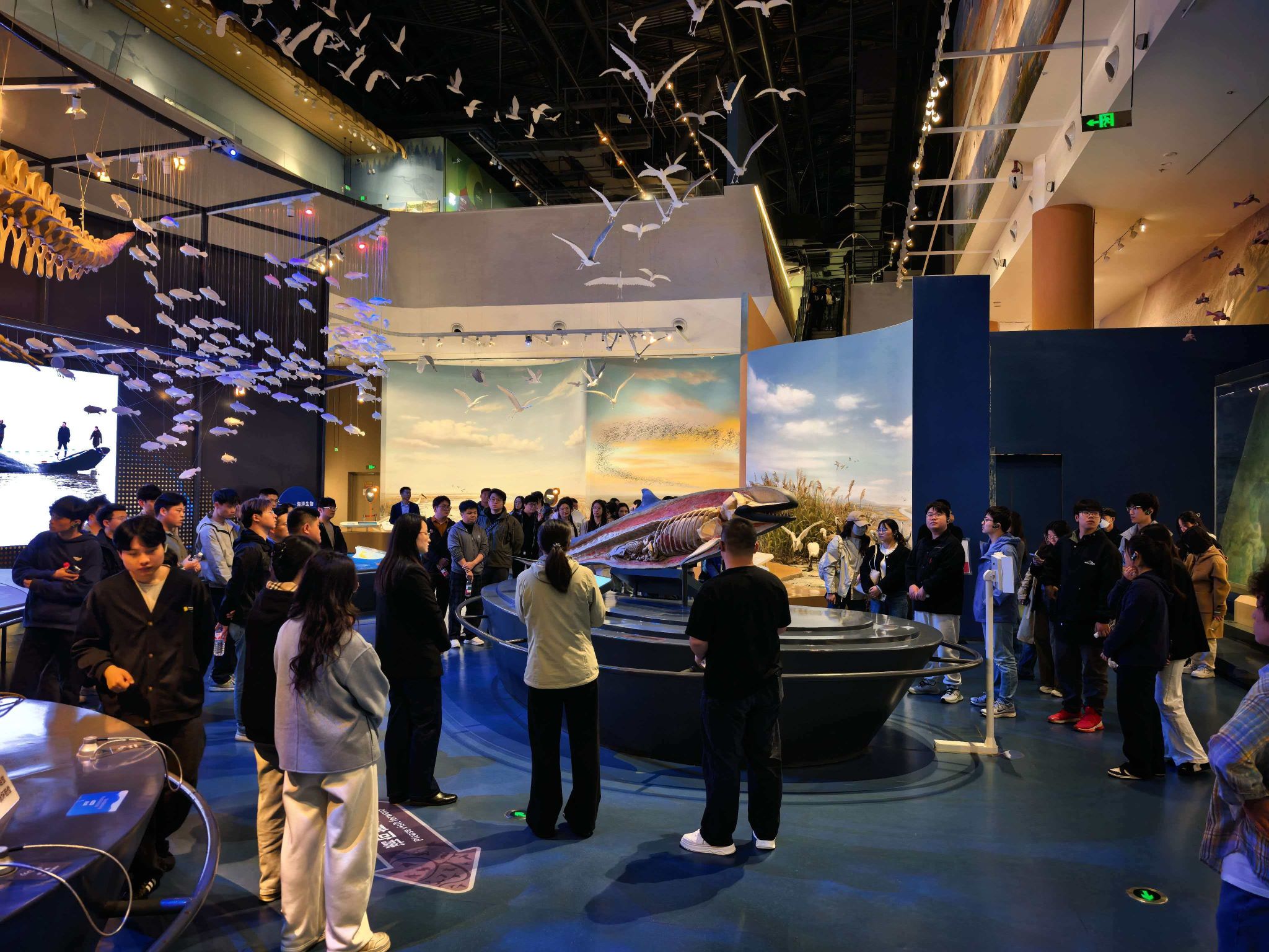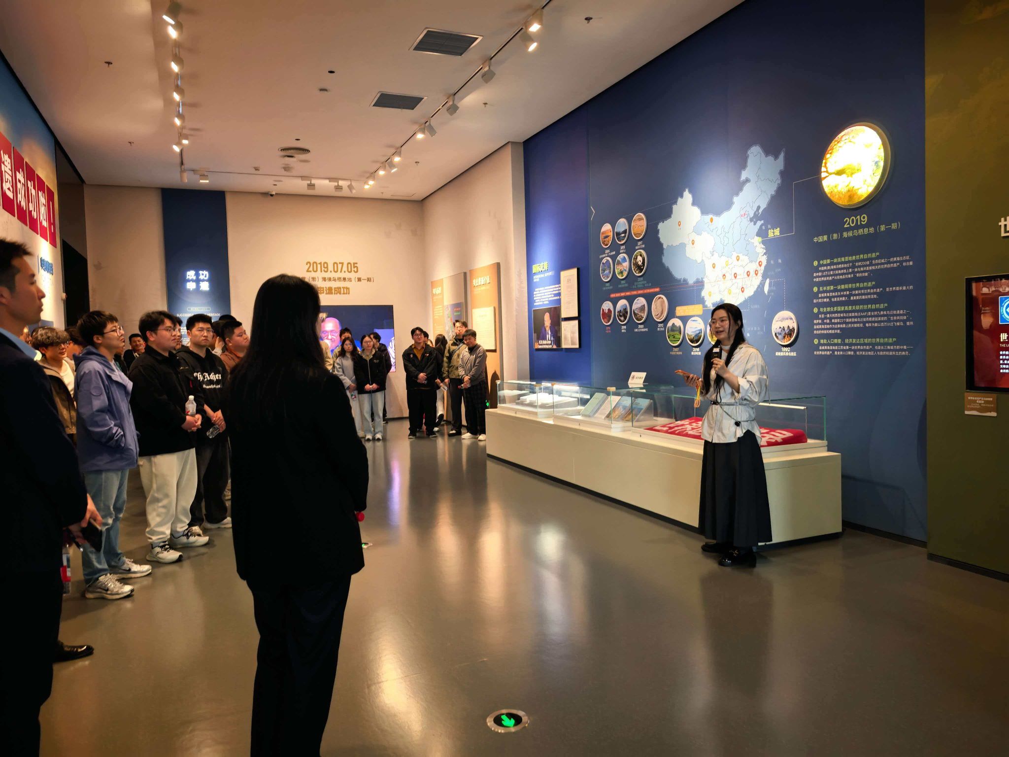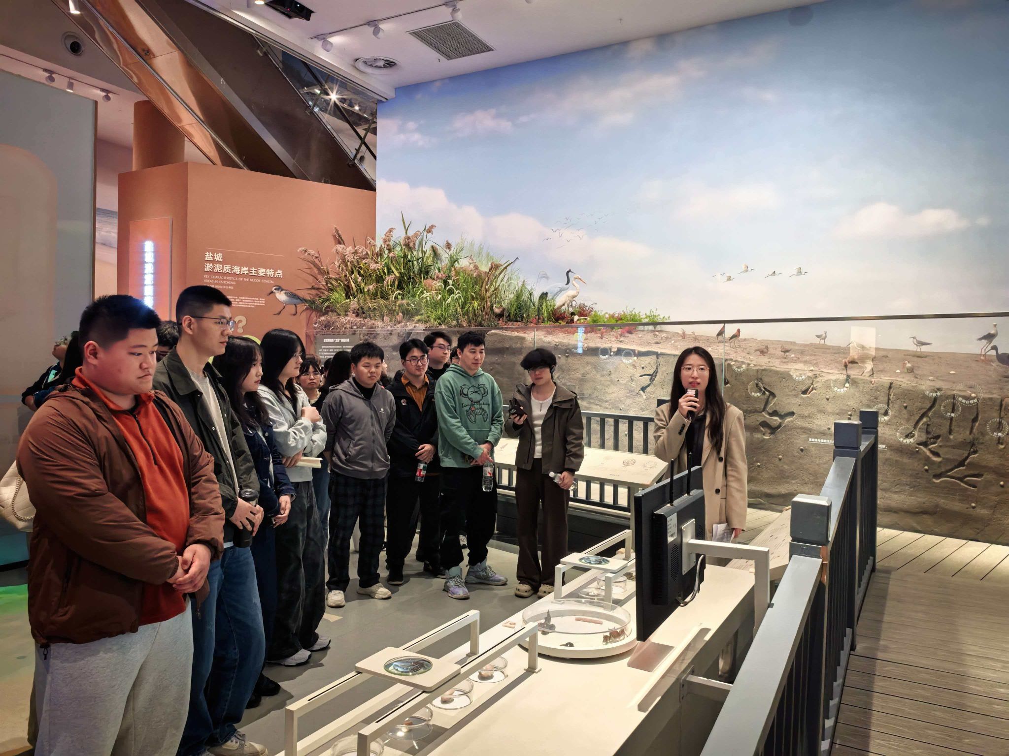 活动伊始,博物馆讲解员带领同学们有序参观,详细介绍了盐城黄海湿地作为世界自然遗产保护地的整体情况,重点讲解了丹顶鹤、麋鹿、勺嘴鹬等候鸟的栖息地特征、生存现状及保护举措,让同学们全面了解湿地作为候鸟家园的独特价值,深刻认识到盐城黄海湿地在全球生物多样性保护中的重要地位。讲解员强调,湿地保护不仅关系到本土生态平衡,更关乎全球候鸟迁徙安全,为同学们后续理解湿地科研与生态修复工作奠定了坚实基础。随后,活动围绕湿地科研、生态修复重点,有序开展专业授课与深度参观,实现理论与实景的深度融合。