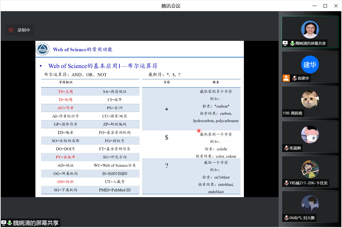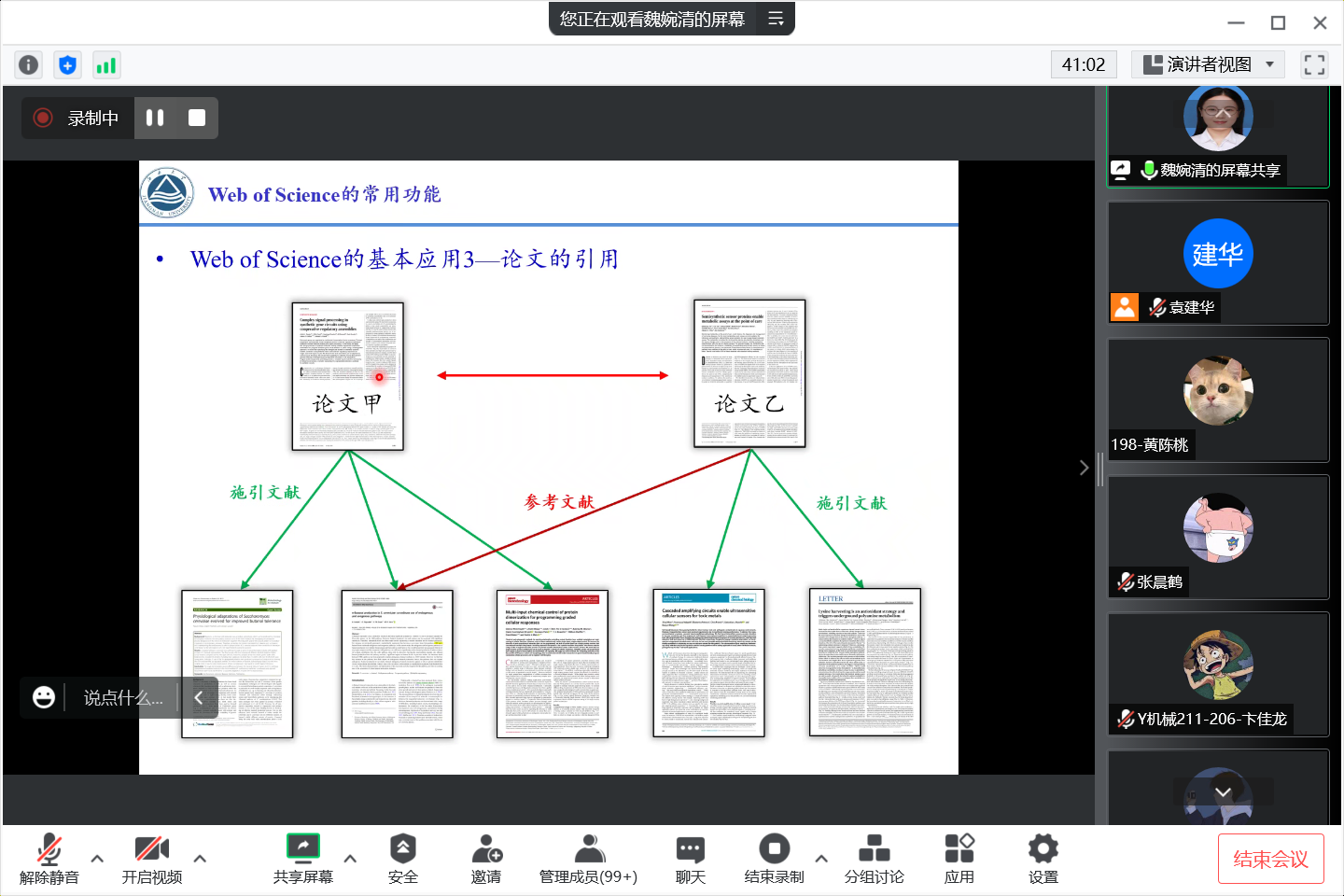 魏婉清老师结合自己的研究方向,介绍了“Web of science”科睿唯安的学术信息整合平台,指导同学们如何应用数据库,如何提升自己的科研素养,希望同学们积极利用好各个平台,阅读前沿的有影响力的文献,不断探索研究和实践创新,积累厚实基础,及早做出科研成果。