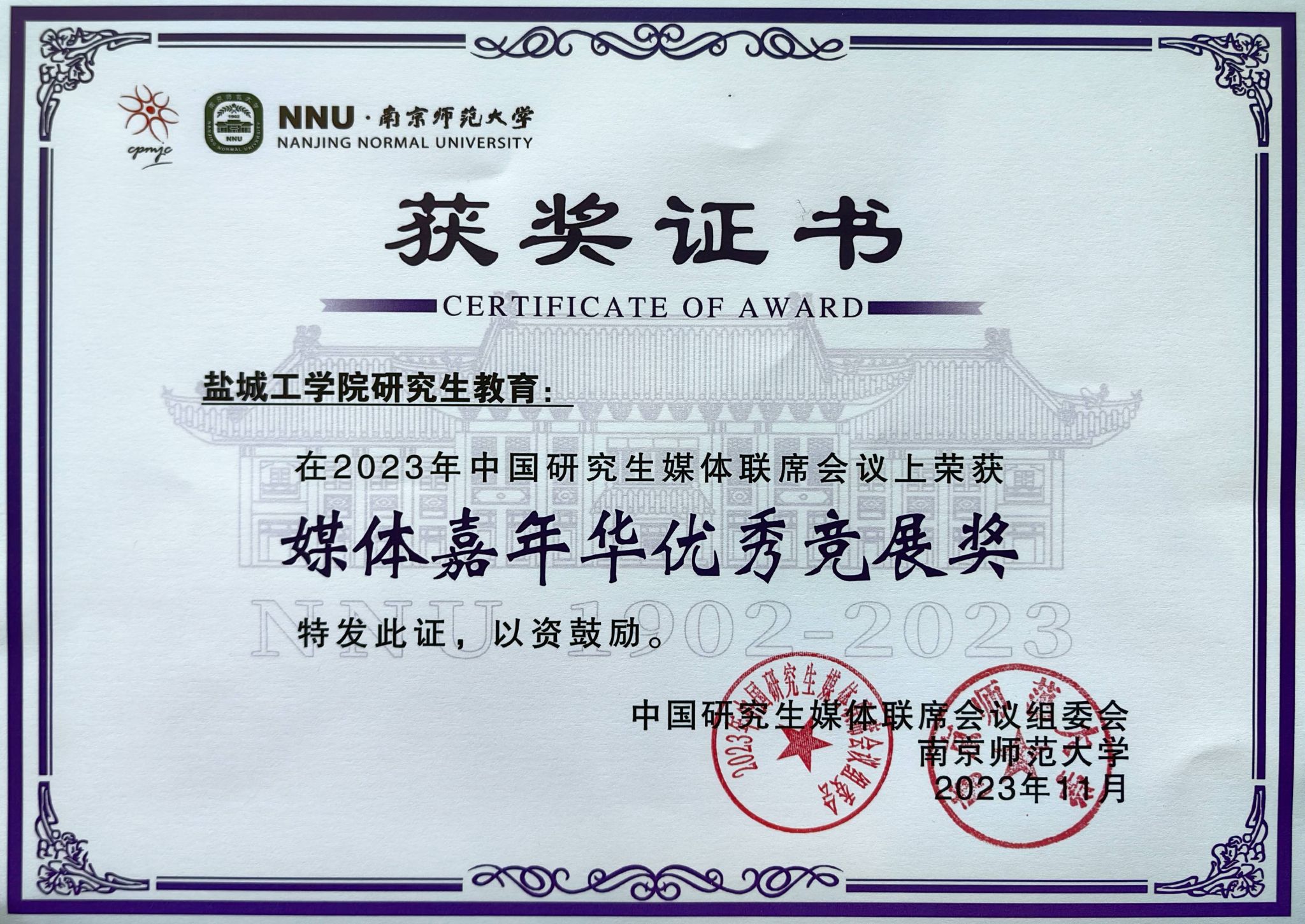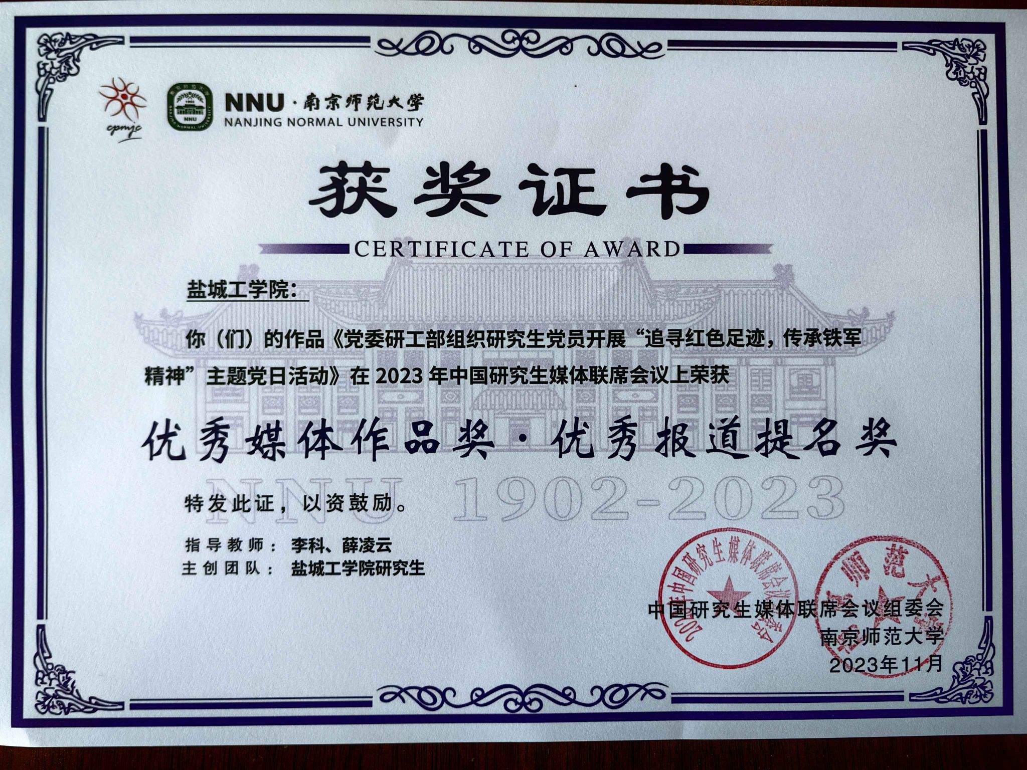 经自主申报、组委会评审、高校互评等环节,我校报送的作品《党委研工部组织研究生党员开展“追寻红色足迹,传承铁军精神”主题党日活动》荣获优秀媒体作品奖·优秀报道提名奖、《盐城工学院研究生教育》荣获媒体嘉年华优秀竞展奖,实现了我校研究生教育媒体作品获奖零的突破。