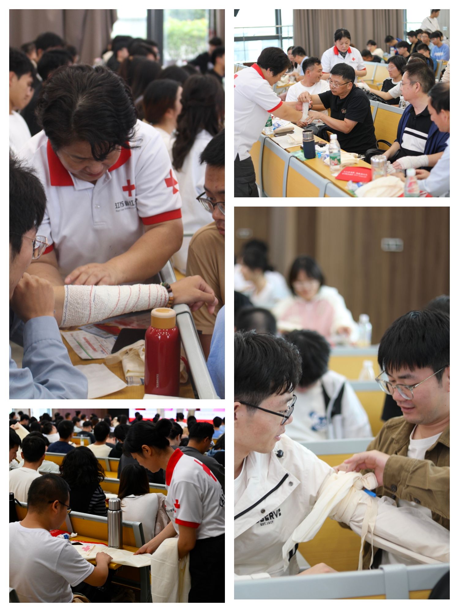 盐城市红会救护培训师张琼丹以通俗易懂、风趣幽默的语言,结合模拟示范向师生们着重讲解了心肺复苏术、海姆立克急救法、AED操作步骤及急救包扎手法等应急处理方法。在全场师生理论考核通过的基础上,培训师有序组织师生对心肺复苏术的迅速呼救、意识确认、胸外按压、开放气道、人工呼吸、AED使用等步骤进行实操检验;引导师生两两分组,进行急救包扎的实践练习。培训现场师生积极互动,气氛活跃,救护培训师们不厌其烦地指导纠正师生各环节的姿势、手法等,确保动作标准规范。所有学员都准确掌握了相关急救知识与技能,全部通过了考核。