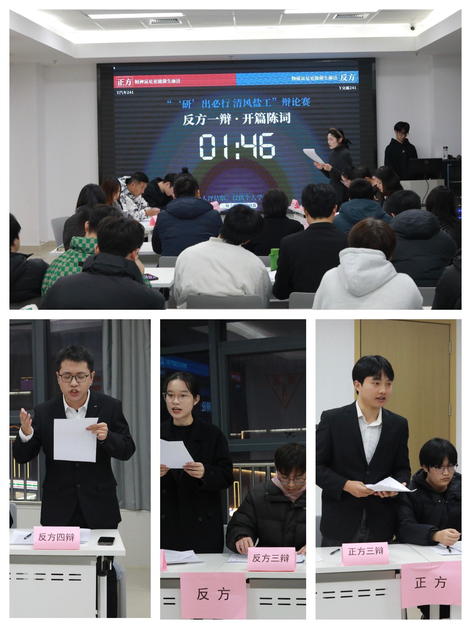 辩论赛自启动以来,吸引了来自不同班级的8支队伍参赛,历经初赛、复赛的激烈比拼,最终4支队伍晋级到决赛争夺冠亚季军。他们分别围绕“精神富足还是物质富足更能催生廉洁”和“正向激励还是追责问责更能让学生干部主动担当作为”展开了激烈的辩论。辩手们思维敏捷、论据充实,在言语交锋中展现思辩光芒。他们不仅阐述了自己的观点,还巧妙回应了对方的质询,展现了高超的辩论技巧和沉稳的心理素质。辩手们引经据典、旁征博引,用犀利的言辞和严密的逻辑赢得了观众的阵阵掌声。