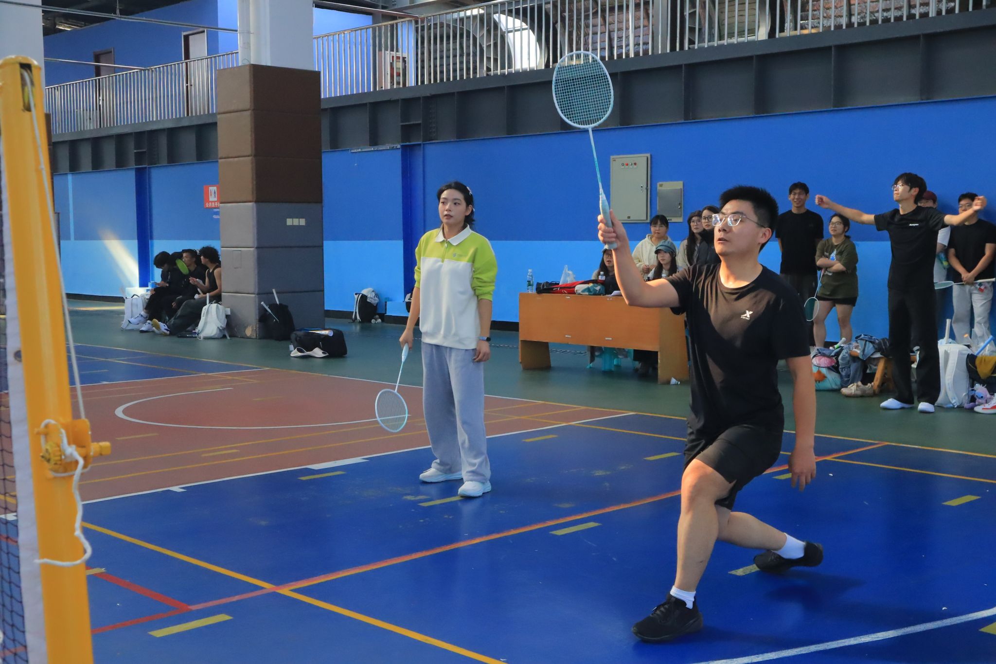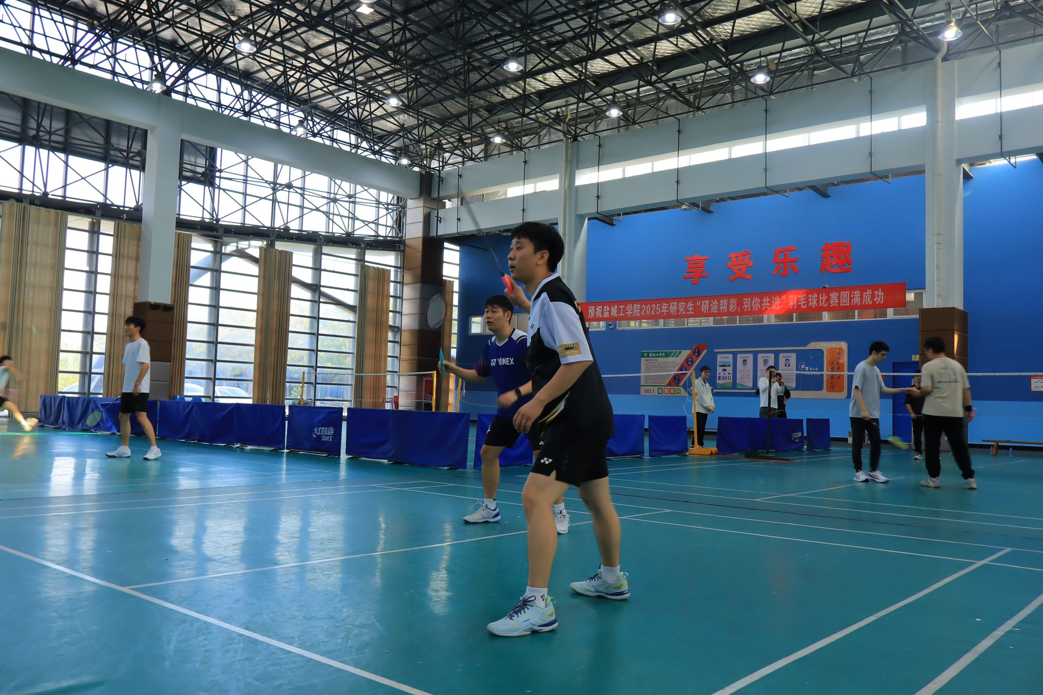 赛场上,洁白的羽毛球在空中划出一道道优美弧线,奏响了力与美的交响。运动员们身手敏捷、步伐矫健,网前精巧搓放与后场势大力沉的劈杀扣吊相得益彰。每一次精彩扑救引来阵阵惊呼,每一记精准落点博得满堂喝彩。选手们全情投入、挥洒汗水,将高远球、吊球、跳杀等专业技术展现得淋漓尽致,充分展现了羽毛球运动的魅力与我校研究生蓬勃向上的精神风貌。整个赛场气氛热烈,加油声、欢呼声此起彼伏,汇聚成激情与欢乐的海洋。