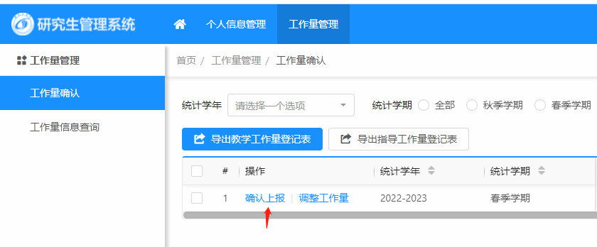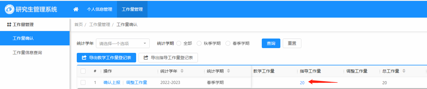 1.研究生指导教师、任课教师登录“研究生管理系统(注意选择“教职工”身份)——培养管理——工作量管理”核对并确认本学期研究生指导或者教学工作量;