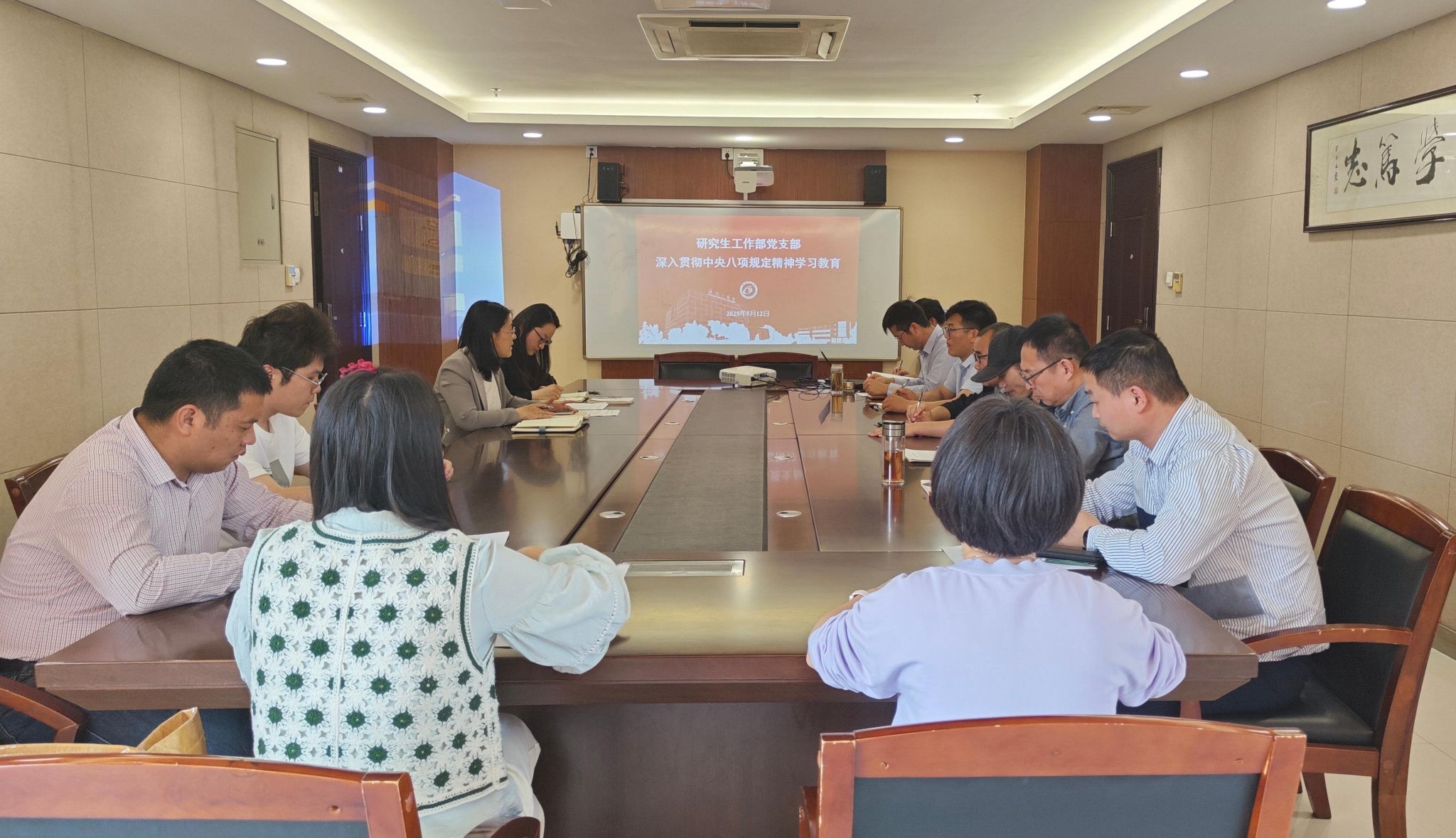 5月12日下午,在行政楼428会议室,党委研究生工作部党支部召开深入贯彻中央八项规定精神学习教育暨5月份政治理论学习会,围绕“深入贯彻中央八项规定精神”、“党风廉政建设”、“爱国主义教育”等展开学习。党委研究生工作部部长、研究生院院长、学科建设办公室主任许伟主持,支部全体成员参加学习。