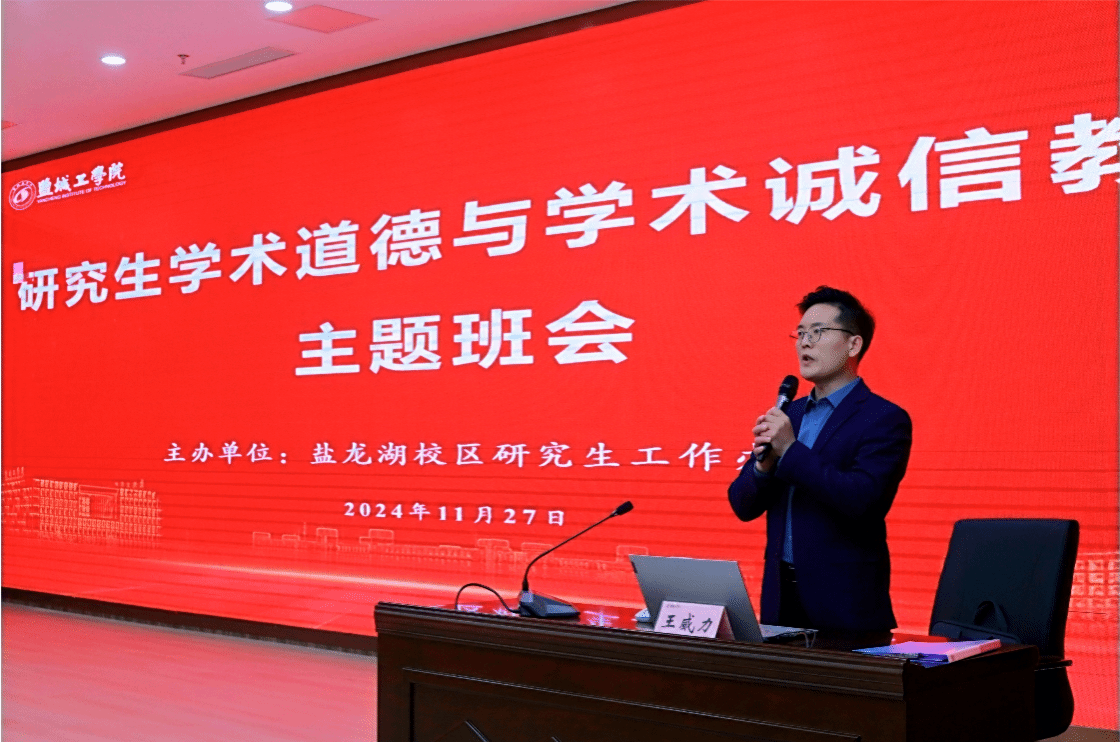 为增强我校2024级研究生学术道德与科研诚信意识,引导研究生树立正确的学术道德观念,坚守科研诚信,杜绝学术不端行为,营造风清气正的校园学术环境。11月27日,党委研究生工作部在盐龙湖校区教学楼报告厅组织开展“学在盐工、立正学风、学术有道、诚信为德”主题教育活动。活动由研究生院盐龙湖校区研究生工作办公室副主任王威力主持,全体2024级研究生参加。