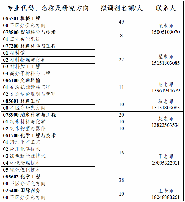 交通运输 (汽车工程学院) | 工学 | 仅接受086100交通运输、080200机械工程、085500机械、085502车辆工程、080204车辆工程、080701工程热物理 |